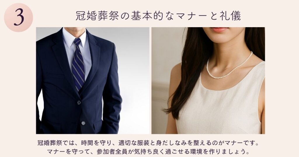 冠婚葬祭では、時間を守り、適切な服装と身だしなみを整えるのがマナーです。マナーを守って、参加者全員が気持ち良く過ごせる環境を作りましょう。