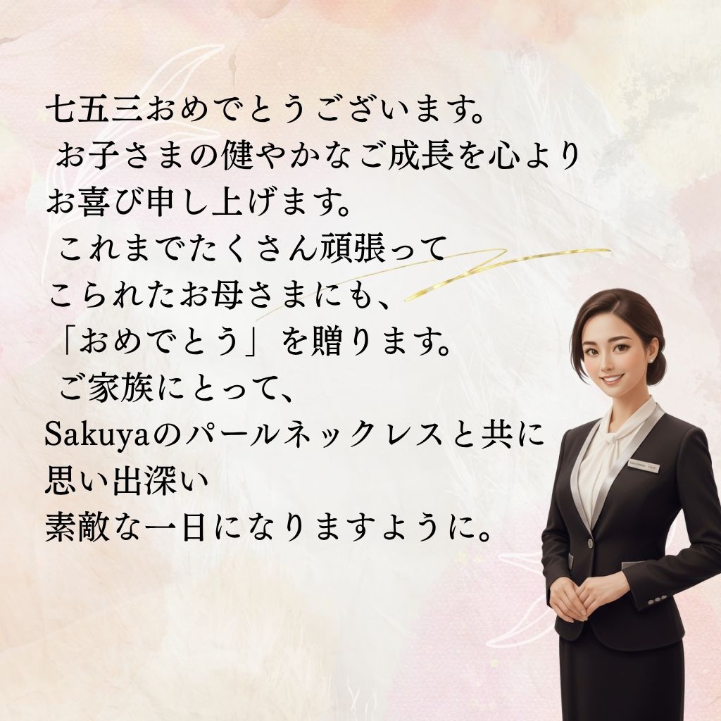 一生に一度の七五三。写真に映る私の首元に輝くパールが、家族の記念日をそっと彩ってくれました。
