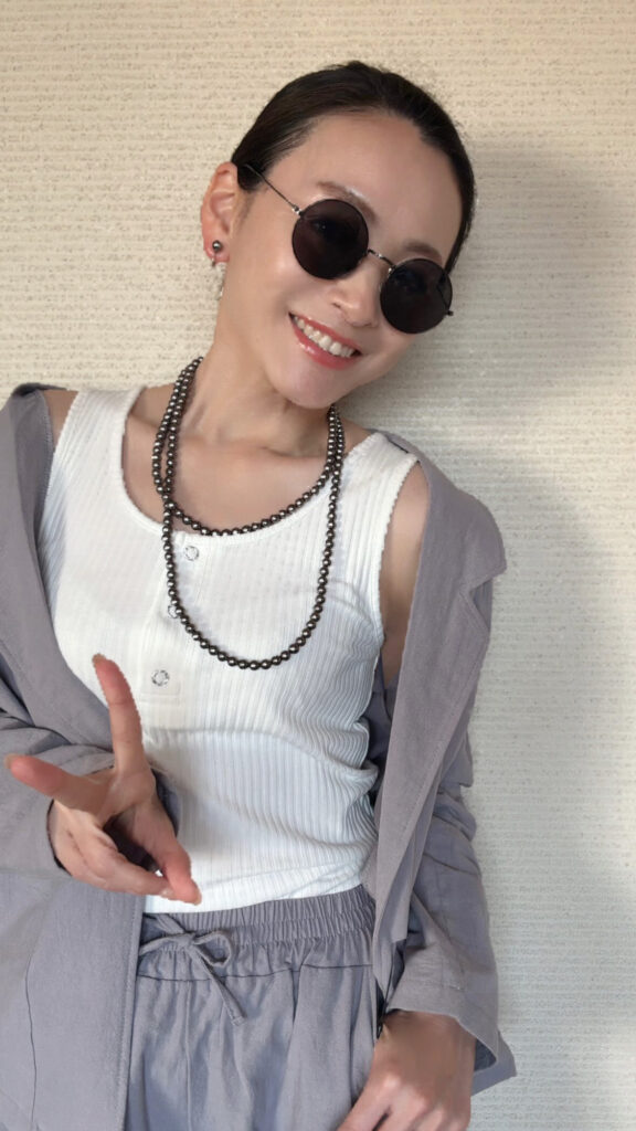 タンクトップ×パールネックレスのヘルシーコーディネートもおすすめ。胸元がざっくりと開いているコーデも、パールを添えることで「部屋着感」がなくなり、こなれた上級者おしゃれの雰囲気に。