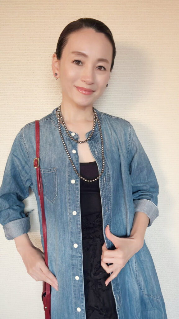 デニムのカジュアルさとパールの上品さが絶妙に調和し、こなれ感たっぷりのスタイルに。休日のお出かけにもぴったりで、気負わずにパールを楽しめます。