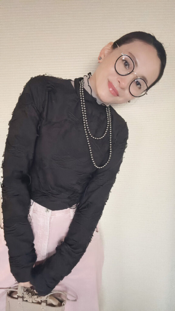 ブラックのロングパールネックレスとニットのコーデもおしゃれ感抜群。冬のコーデは黒が増えがちですが、同じ黒でもきらりと光るパールがプラスされるだけでお顔がぱっと明るくなります。